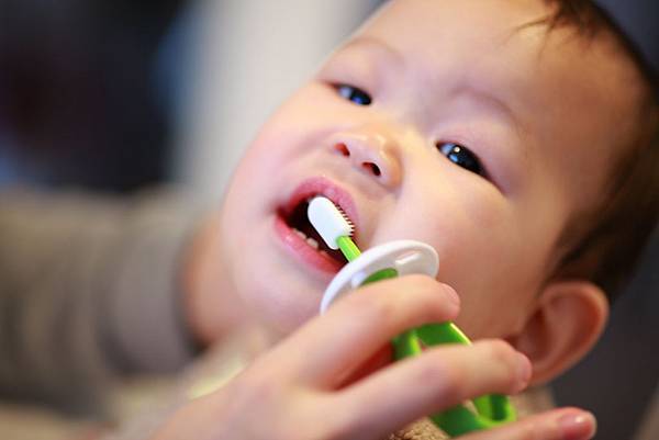 刷完之後就讓她自己拿著牙刷,她居然也"有模有樣"的刷自己的牙齒~(當然是刷不到啦~只是有模仿媽媽的動作)