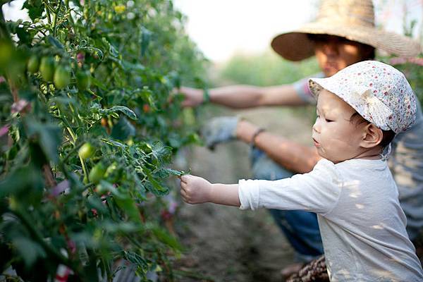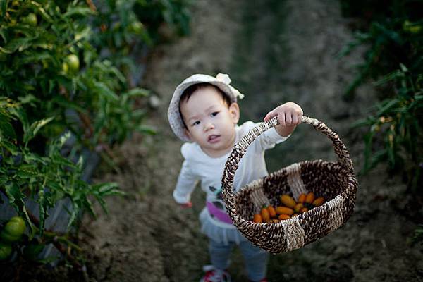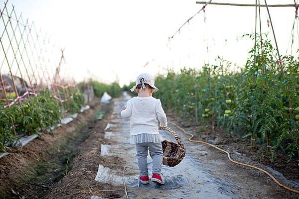 我們讓她親手摘下一粒粒成熟的小番茄,她玩得好開心,我們也很開心~