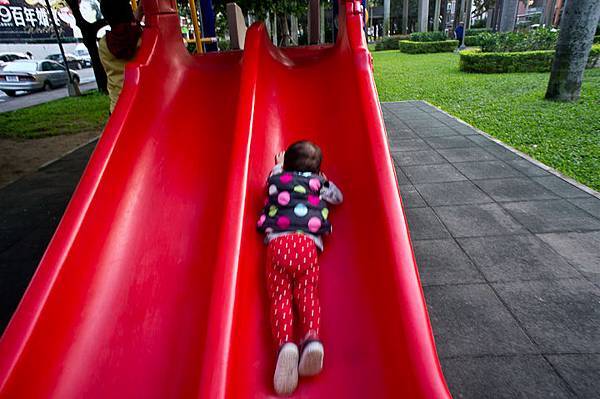 除了第一次玩溜滑梯是我陪她走上去玩,之後我們就放手讓她自己一步一步爬上去,