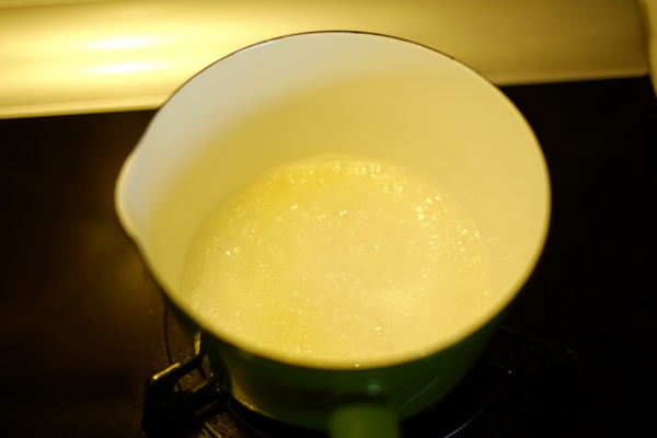 2. 細砂糖及冷開水放入鍋中,搖晃一下讓他混合均勻(不要攪拌喔)