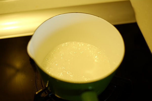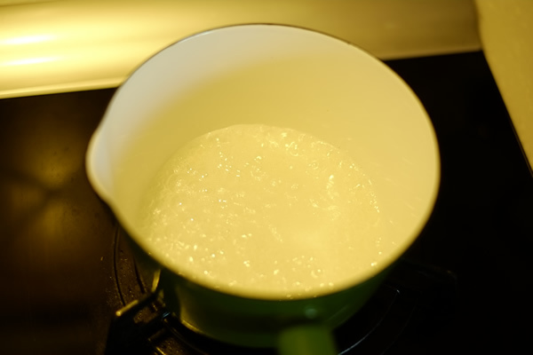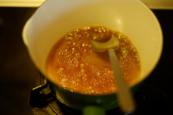 4. 煮到變成深咖啡色的時候,要馬上關火,再將煮熱的動物性鮮奶油到入,迅速攪拌均勻後放涼備用