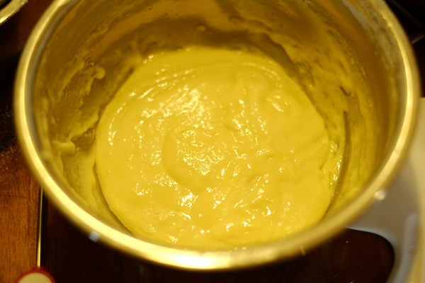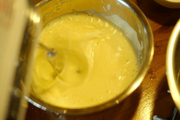 3. 將鋼盆放到熱水上隔水加熱,並一邊用攪拌器攪打至麵糊40度,就可以從熱水上移開~
