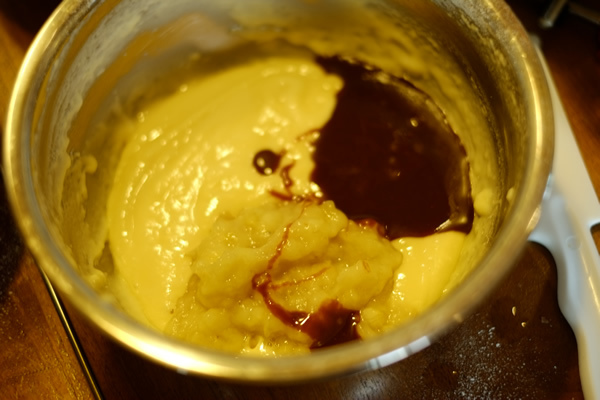 7. 在加入香蕉泥和焦糖醬拌勻,最後加入融化的奶油拌勻