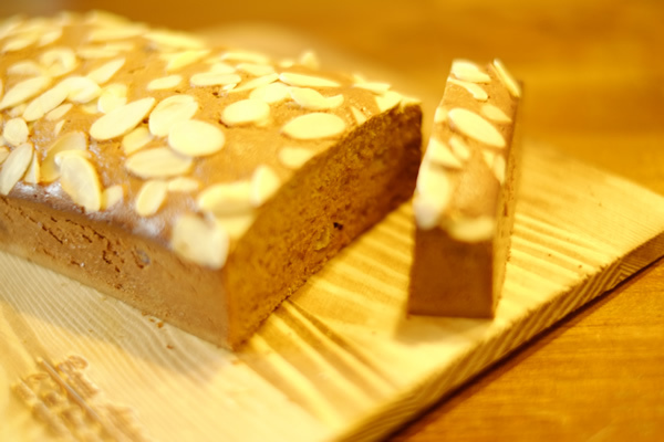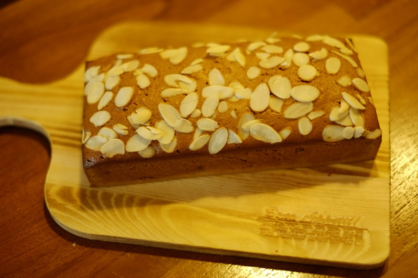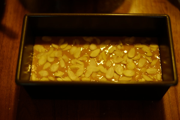 8. 在將麵糊到入烤模中,在表面鋪上杏仁片,然後送進預熱好的烤箱烤40分鐘